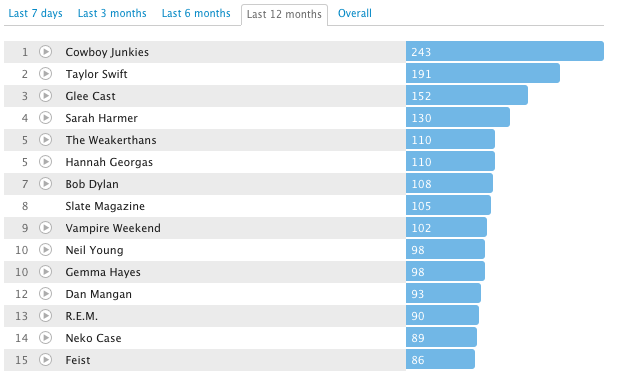 Will that be a burden? As it happens, I’m an obsessive self-documenter, and so for years have tracked my musical taste with Last.fm. Here’s what I’ve listened to over the last 12 months: